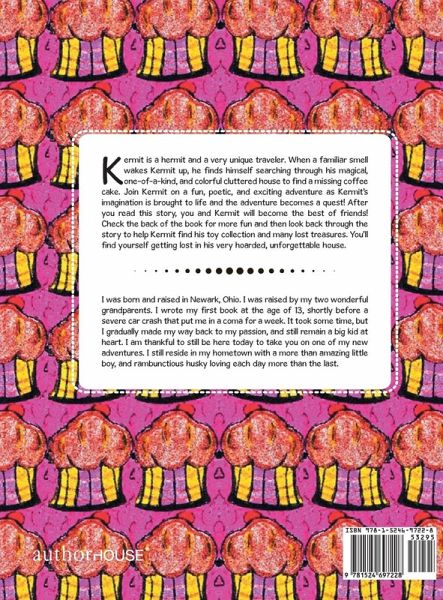 Kermit is a hermit and a very unique traveler. When a familiar smell wakes Kermit up, he finds himself searching through his magical, one-of-a-kind, and colorful cluttered house to find a missing coffee cake. Join Kermit on a fun, poetic, and exciting adventure as Kermit's imagination is brought to life and the adventure becomes a quest! After you read this story, you and Kermit will become the best of friends! Check the back of the book for more fun and then look back through the story to help Kermit find his toy collection and many lost treasures. You'll find yourself getting lost in his very hoarded, unforgettable house.