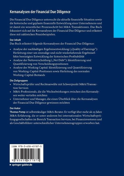 Die Financial Due Diligence untersucht die aktuelle finanzielle Situation sowie die historische und geplante finanzielle Entwicklung eines Unternehmens und ist damit ein wesentlicher Prozessschritt bei M&A-Transaktionen. Das Buch fokussiert sich auf die Kernanalysen der Financial Due Diligence und erläutert diese mit zahlreichen Praxisbeispielen.