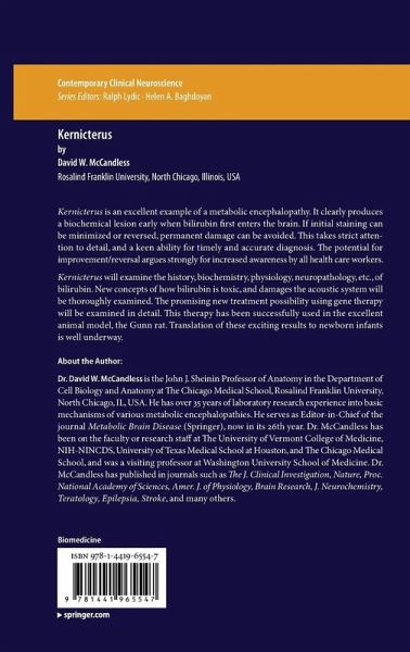Dedication page.- Preface.- Acknowledgement.- Key words.-Chapter 1 Prologue: Hyperbilirubinemia, kernicterus, and world health concerns.-Chapter 2 History of bilirubin.-Chapter 3 Biochemistry and physiology of bilirubin.- Chapter 4 Prematurity.- Chapter 5 Erythroblastosis fetalis.- Chapter 6 Gunn rats.- Chapter 7 Crigler-Najjar Syndrome.- Chapter 8 Neuropathology of kernicterus.- Chapter 9 Bilirubin and energy metabolism.- Chapter 10 Bilirubin and other biochemical changes.- Chapter 11 Jaundice and breast milk.- Chapter 12 Jaundice and malaria.- Chapter 13 Jaundice and congenital pyloric stenosis.- Chapter 14 Phototherapy for hyperbilirubinemia.- Chapter 15 Non phototherapy treatment.- Chapter 16 Hyperbilirubinemia revisited.- Chapter 17 Auditory brainstem response.- Chapter 18 Progressive familial intrahepatic cholestasis.- Chapter 19 Kernicterus in older children and adults.- Chapter 20 Cerebral palsy and counseling.- Chapter 21 Neurological sequelae from jaundice.- Chapter 22 Neurobehavioral teratology.- Chapter 23 Gene therapy for hyperbilirubinemia.- Chapter 24 Epilog: Kernicterus: comments and future directions.- Appendix.- References.- Index.