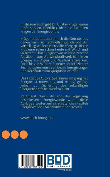 In diesem Buch gibt Dr. Gustav Krüger einen umfassenden Überblick über die aktuellen Fragen der Energiepolitik. Veranlasst durch die von der Regierung beschlossene Energiewende wurde diese Auflage erweitert um ein zusätzliches Kapitel: Energiewende - Machbarkeit und Kosten. Krüger erläutert ausführlich die Gründe, aus denen man sich schnellstmöglich von der Vorstellung verabschieden sollte, energiepolitische Probleme seien schon heute mit Wind- und Solarkraft zu lösen. Es gibt zwar vielversprechende Ansätze - vom Aufwindkraftwerk bis hin zu Energie aus Algen und Wellenkraftwerken. Doch bis zur Marktreife neuer und effizienter Technologien muss auf fossile Energieträger und Kernkraft zurückgegriffen werden.Das Fazit des Autors: Sparsamer Umgang mit Energie ist notwendig und richtig, genügt jedoch zur Sicherung des zukünftigen Energiebedarfs bei weitem nicht.