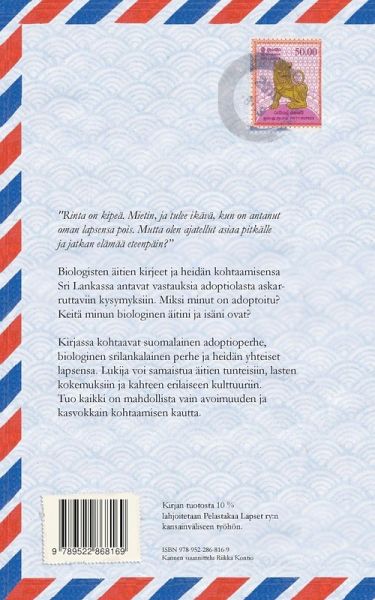Kirjassa kohtaavat suomalainen adoptioperhe, biologinen srilankalainen perhe ja heidän yhteiset lapsensa. Lukija voi samaistua äitien tunteisiin, lasten kokemuksiin ja kahteen erilaiseen kulttuuriin. Tuo kaikki on mahdollista vain avoimuuden ja kasvokkain kohtaamisen kautta.