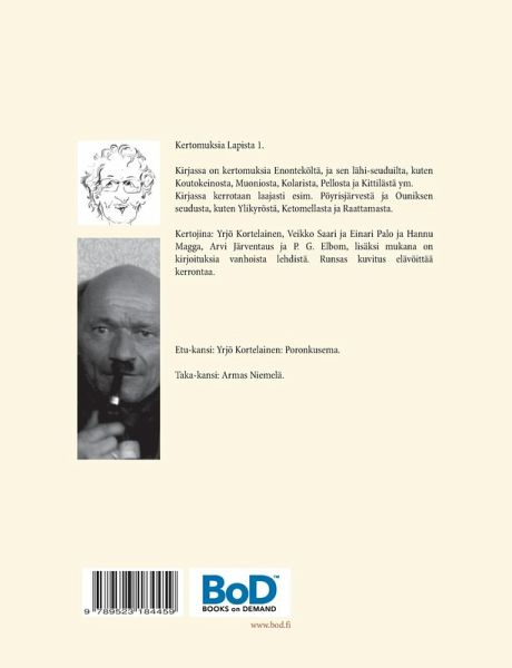 Kertomuksia Lapista 1. Kirjassa on kertomuksia Enonteköltä ja sen lähi-seuduilta, kuten Koutokeinosta, Muoniosta, Kolarista, Pellosta ja Kittilästä ym. Mukana on esim. runsas kuvitus ja kerronta Pöyrisjärvestä ja sen historiasta. Kertojina: Yrjö Kortelainen, Veikko Saari ja Einari Palo, Arvi Järventaus, P. G. Elbom ja Hannu Magga, lisäksi mukana on kirjoituksia vanhoista lehdistä. Runsas kuvitus elävöittää kerrontaa. Sivuja 348, kuvia 126 kpl.