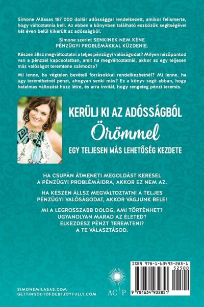 Simone Milasas 187 000 dollár adósággal rendelkezett, amikor felismerte, hogy változtatnia kell. Az ebben a könyvben található eszközök segítségével két éven belül kikerült az adósságból. Simone szerint SENKINEK NEM KÉNE PÉNZÜGYI PROBLÉMÁKKAL KÜZDENIE. Készen állsz megváltoztatni a teljes pénzügyi valóságodat? Milyen néz¿pontod van a pénzzel kapcsolatban, amit ha megváltoztatnál, akkor az egy teljesen más valóságot teremtene számodra? Mi lenne, ha végtelen bevételi forrásokkal rendelkezhetnél? Mi lenne, ha úgy teremthetnél pénzt, ahogyan senki más? Ez a könyv segít abban, hogy hatalmas változást hozz létre, és arra invitál, hogy rengeteg pénzt teremts. KERÜLJ KI AZ ADÓSSÁGBÓL ÖRÖMMEL EGY TELJESEN MÁS LEHET¿SÉG KEZDETE. HA CSUPÁN ÁTMENETI MEGOLDÁST KERESEL A PÉNZÜGYI PROBLÉMÁIDRA, AKKOR EZ NEM AZ. HA KÉSZEN ÁLLSZ MEGVÁLTOZTATNI A TELJES PÉNZÜGYI VALÓSÁGODAT, AKKOR VÁGJUNK BELE! MI A LEGROSSZABB DOLOG, AMI TÖRTÉNHET? UGYANOLYAN MARAD AZ ÉLETED? ELKEZDESZ PÉNZT TEREMTENI? A TE VÁLASZTÁSOD.