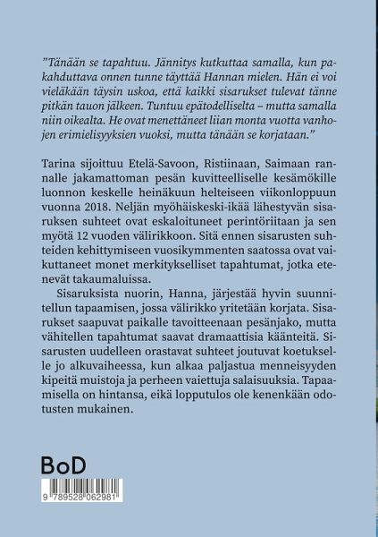 Kesämökki-romaani on realistinen fiktio. Tarina kertoo neljän myöhäiskeski-ikää lähestyvän sisaruksen suhteista, jotka ovat eskaloituneet perintöriitaan ja sen myötä 12 vuoden välirikkoon. Tarina sijoittuu Etelä-Savoon, Ristiinaan Saimaan rannalle jakamattoman pesän kuvitteelliselle kesämökille tapahtumarikkaaseen heinäkuun viikonloppuun vuonna 2018, jolloin perintöriitojen aiheuttamaa välirikkoa yritetään korjata. Sisarusten uudelleen orastavat suhteet joutuvat koetukselle jo alkuvaiheessa, kun alkaa paljastua menneisyyden kipeitä muistoja ja perheen vaiettuja salaisuuksia. Tapaamisella on hintansa, eikä lopputulos ole kenenkään odotusten mukainen.…mehr