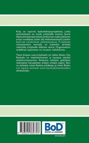 Tässä kirjassa case-yritykseksi on valittu Kesko Oyj. Keskolla on mielenkiintoinen ja haastava tehtävä yhteiskunnassamme. Keskossa tehtävät päätökset vaikuttavat kansalaisten arkeen erittäin paljon. Siksi on tärkeätä, miten Keskoa johdetaan ja miten Kesko voi oppia entistä suorituskykyisemmäksi tehtävässään.