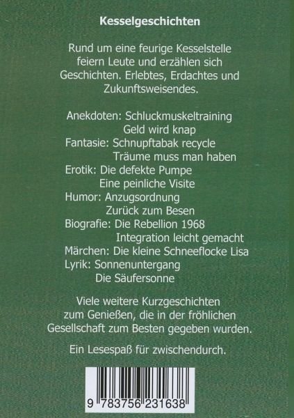 KesselgeschichtenRund um eine feurige Kesselstelle feiern Leute und erzählen sich Geschichten. Erlebtes, Erdachtes und Zukunftsweisend.Anekdoten: Schluckmuskeltraining, Geld wird knappFantasie: Schnupftabak recycle, Träume muss man haben.Erotik: die defekte Pumpe, peinliche Visite.Humor: Anzugsordnung, Zurück zum Besen. Biografie: die Rebellion 1968, Integration leicht gemacht.Märchen: die kleine Schneeflocke Lisa.Lyrik: Sonnenuntergang, kein zurück ins Glück.Viele weitere Kurzgeschichten zum Genießen, die in der fröhlichen Gesellschaft zum Besten gegeben wurden.Ein Lesespaß für zwischendurch.