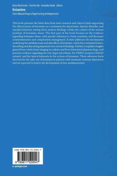 This book presents the latest data from basic research and clinical trials supporting the effectiveness of ketamine as a treatment for depression, bipolar disorder, and suicidal behavior, setting these positive findings within the context of the serious problem of ketamine abuse. The first part of the book focuses on the evidence regarding ketamine abuse, with specific reference to Asian countries, and discusses countermeasures and complication management. It then addresses the mechanisms underlying the antidepressant and side effects of ketamine, which have remained elusive, describing and discussing important new research findings. Further, it explains insights gained from whole brain imaging in rodents and from behavioral pharmacology, and presents evidence regarding the role of gut microbiota, the NMDA receptor GluN2D subunit, and the lateral habenula in the actions of ketamine. These advances form the basis for the safer use of ketamine in patients with treatment-resistant depression and are expected to lead to the development of new antidepressants.
