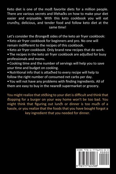 Keto diet is one of the most favorite diets for a million people. There are various secrets and lifehacks on how to make your diet easier and enjoyable. With this keto cookbook you will eat crunchy, delicious, and tender food and follow keto diet at the same time! Let's consider the strongest sides of the keto air fryer cookbook: ¿ Keto air fryer cookbook for beginners and pro. No one will remain indifferent to the recipes of this cookbook. ¿ Keto air fryer cookbook. Only brand new recipes that do work. ¿ The recipes in the keto air fryer cookbook are adjusted for busy professionals and moms. ¿ Cooking time and the number of servings will help you to save your time and budget on cooking. ¿ Nutritional info that is attached to every recipe will help to follow the right number of consumed net carbs per day. ¿ You will not have any problems with finding ingredients. All of them are easy to buy in the nearest supermarket or grocery. You might realize that sticking to your diet is difficult and think that stopping for a burger on your way home won't be too bad. You might think that figuring out lunch or dinner is too much of a hassle, or you realize that the foods that you have bought forgot a key ingredient that you needed for dinner.