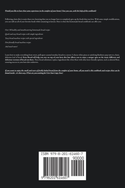 Would you like to have that same experience in the comfort of your home? Now you can, with the help of this cookbook! Following a keto diet is easier than ever, knowing that you no longer have to completely give up the foods that you love. With some simple modifications, you can still eat all of your favorite foods while remaining in ketosis. Here is what this homemade bread cookbook can offer you: Over 30 healthy and mouthwatering homemade bread recipes Quick and easy bread recipes with simple ingredients Tasty bread machine recipes with special ingredients Diet-friendly bread machine recipes And much more! Learn how to make everything from sweet, pull-apart caramel monkey bread to a savory 3-cheese white pizza or satisfying blueberry pop tarts to a basic, delicious loaf of bread. Keto Bread will help you stay on top of your keto diet but allows you to enjoy a unique spin on the many different and delicious versions of bread out there. These bread substitutes replace ingredients like white flour with other keto-friendly options, such as almond flour, ensuring success in your keto diet endeavors. If you want to enjoy the smell and taste of freshly baked bread from the comfort of your home, all you need is this cookbook and recipes that can be found inside - it's that easy. What are you waiting for? Get Your Copy Now!