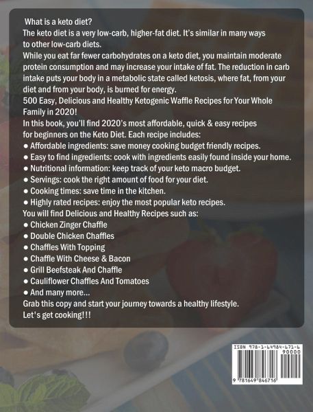 1. What is a keto diet? The keto diet is a very low-carb, higher-fat diet. It's similar in many ways to other low-carb diets. While you eat far fewer carbohydrates on a keto diet, you maintain moderate protein consumption and may increase your intake of fat. The reduction in carb intake puts your body in a metabolic state called ketosis, where fat, from your diet and from your body, is burned for energy. 500 Easy, Delicious and Healthy Ketogenic Waffle Recipes for Your Whole Family in 2020! In this book, you'll find 2020's most affordable, quick & easy recipes for beginners on the Keto Diet. Each recipe includes: ● Affordable ingredients: save money cooking budget friendly recipes. ● Easy to find ingredients: cook with ingredients easily found inside your home. ● Nutritional information: keep track of your keto macro budget. ● Servings: cook the right amount of food for your diet. ● Cooking times: save time in the kitchen. ● Highly rated recipes: enjoy the most popular keto recipes. You will find Delicious and Healthy Recipes such as: ● Chicken Zinger Chaffle ● Double Chicken Chaffles ● Chaffles With Topping ● Chaffle With Cheese & Bacon ● Grill Beefsteak And Chaffle ● Cauliflower Chaffles And Tomatoes ● And many more... Grab this copy and start your journey towards a healthy lifestyle. Let's get cooking!!!
