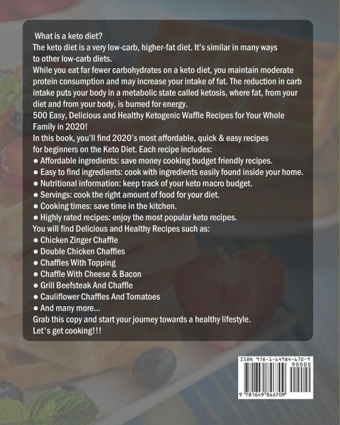 1. What is a keto diet? The keto diet is a very low-carb, higher-fat diet. It's similar in many ways to other low-carb diets. While you eat far fewer carbohydrates on a keto diet, you maintain moderate protein consumption and may increase your intake of fat. The reduction in carb intake puts your body in a metabolic state called ketosis, where fat, from your diet and from your body, is burned for energy. 500 Easy, Delicious and Healthy Ketogenic Waffle Recipes for Your Whole Family in 2020! In this book, you'll find 2020's most affordable, quick & easy recipes for beginners on the Keto Diet. Each recipe includes: ● Affordable ingredients: save money cooking budget friendly recipes. ● Easy to find ingredients: cook with ingredients easily found inside your home. ● Nutritional information: keep track of your keto macro budget. ● Servings: cook the right amount of food for your diet. ● Cooking times: save time in the kitchen. ● Highly rated recipes: enjoy the most popular keto recipes. You will find Delicious and Healthy Recipes such as: ● Chicken Zinger Chaffle ● Double Chicken Chaffles ● Chaffles With Topping ● Chaffle With Cheese & Bacon ● Grill Beefsteak And Chaffle ● Cauliflower Chaffles And Tomatoes ● And many more... Grab this copy and start your journey towards a healthy lifestyle. Let's get cooking!!!