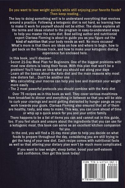 Do you want to lose weight quickly while still enjoying your favorite foods? Then keep reading... The key to doing something well is to understand everything that revolves around a practice. Following a ketogenic diet is not hard, so learning how to make it work for yourself should not be either. The ebook explains all the terms and ideas related to the program in easy-to-understand ways to help you master the keto diet. Best selling author and nutritionist expert Clarissa Fleming is about to guide you as you figure out the kind of nutrition that your body needs as well. No more excuses! What's more is that there are ideas on how and where to begin, how to get back on the fitness track, and how to make your ketogenic dieting experience fun enclosed here. In this book, you'll discover: Secret 21-Day Meal Plan for Beginners. One of the biggest problems with most new dieters is losing their focus. With this plan that won't be a problem! You'll have clear idea about what you should eat along your days Learn all the basics about the Keto diet and the main reasons why most new dieters fail... Don't be another one Why calculating your macros can help you lose and maintain your weight more easily The 2 most powerful protocols you should combine with the Keto diet Over 75 recipes as in this book as well. They cover various mealtimes from breakfast to dinner and everything in between so that you will be able to curb your cravings and avoid getting distracted by hunger pangs as you work towards your goals. Clarissa Fleming also ensured that all of them are healthy, tasty, and easy to make. This way, you can cook ahead of time or whip up a quick snack for you and your entire family. There happens to be a list of items you can and cannot eat in this guide, too. If you feel stuck and unsure about the ingredients that you can use for a ketogenic meal, this book can serve as an excellent kitchen companion for you. In the end, you will find a 21-day meal plan to help you decide on what foods to prepare throughout the day, considering you are still trying to get the hang of your new diet. Each recipe comes with nutritional facts as well so that altering your dietary plan won't be much more complicated. If you want to lose weight, sleep better, boost your self-esteem and confidence, then scroll up and click the Add to Cart button.