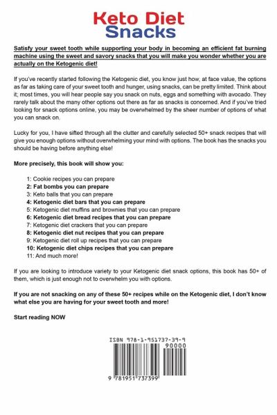 Eggs, avocado and bacon are not the only snack options you can have while on Keto diet; there is more!If you, like 94% of Americans, like snacking, you don’t have to stop snacking to get to and maintain ketosis!Does your resolve to get into ketosis become weak at the sight, smell, mention or thought of sweet and savory snacks like cookies, muffins, brownies, breads, crackers, chips and many more? You know that many are made using ingredients that are not in the keto approved foods list, right? What can you do about it? Can you still have your favorite snacks? Yes, you can have your favorite snacks but they have to be ketonized! If you are looking for keto friendly cookies, muffins, brownies, breads, crackers, chips, bars and other snack options, this book has just that to support you through ketosis. What makes the book unique is that the recipes are not too many to a point of becoming overwhelming. In fact, if you can choose a recipe for each day, you will have enough snacks for about 1 year, assuming you make enough serving of each snack option per week! I have sifted through all the online clutter and carefully selected 50+ of what I consider the best snack recipes that will give you enough options without overwhelming your mind with options. If you stick to these snacks only, you will have lots of success in the keto diet.