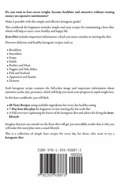 Do you want to lose excess weight, become healthier and attractive without wasting money on expensive nutritionists? Make it possible with this simple and effective ketogenic guide! This cookbook for beginners includes simple and tasty recipes for maintaining a keto diet, which will help to start a new healthy and happy life. Keto Diet includes important information, which you must consider in starting the diet. Discover delicious and healthy ketogenic recipes such as:Breakfasts Smoothies Soups Salads Poultry and Meat Veggies and Side dishes Fish and Seafood Appetizers and Snacks Desserts Each ketogenic recipe contains the full-color image and important information about nutrients (carbs, fats, proteins), which will help you track your progress in rapid weight loss. In this keto cookbook, you will find:60 Tasty Recipes using available ingredients for every day healthy eating 7-Day keto diet plan for beginners to fast starting the low-carb diet A Full overview explaining the basics of the ketogenic diet and advice for living the keto-lifestyle Imagine that just one month on the Keto diet will get you incredible results that is why you will make this meal plan onto a usual lifestyle. This is a collection of simple keto recipes for every day for those, who want to try a ketogenic diet.