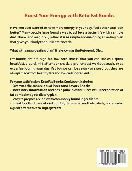Boost Your Energy with Keto Fat Bombs Have you ever wanted to have more energy in your day, feel better, and look better? Many people have found a way to achieve a better life with a simple diet. There is no magic pill; rather, it is as simple as developing an eating plan that gives your body the nutrients it needs. What is this magic eating plan? It is known as the Ketogenic Diet. Fat bombs are are high fat, low carb snacks that you can use as a quick breakfast, a quick mid-afternoon snack, a pre- or post-workout snack, or as extra fuel during your day. Fat bombs can be savory or sweet, but they are always made from healthy fats and low carb ingredients. For your satisfaction, Keto Fat Bombs Cookbook includes: Over 90 delicious recipes of Sweet and Savory Snacks necessary information and basic principles for successful incorporation of fat bombs into your dietary plan easy to prepare recipes with commonly found ingredients ideal food for Low-Carb High Fat, Ketogenic, and Paleo diets, and are also a great alternative to sugary treats