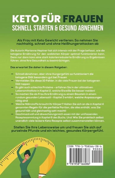 Als Frau mit Keto Gewicht verlieren: So nehmen Sie nachhaltig, schnell und ohne Heißhungerattacken ab Millionen Menschen setzen beim Gewichtsverlust auf die ketogene Ernährung. Selbst Hollywoodstars wie Halle Berry und Megan Fox gelang es, mit der Keto-Diät die Pfunde purzeln zu lassen und einen Traumkörper zu halten. Doch als Frau müssen Sie bei dieser Ernährungsweise einige Aspekte beachten:Schon lange ist bekannt, dass der Körper von Frauen Fett anders verarbeitet. Der Monatszyklus spielt dabei eine große Rolle. Aber auch die Körperfettverteilung ist bei Frauen anders. Deshalb ist es nur logisch, dass dieselben Ernährungsgewohnheiten sich auf Frauen und Männer unterschiedlich auswirken. Die hormonalen Veränderungen von Frauen im Verlauf des Monats beeinflussen, wie der weibliche Körper Nährstoffe verarbeitet. Darauf nehmen die meisten Diät-Pläne keine Rücksicht. Die Keto-Diät hat bei Frauen einen anderen Effekt als bei Männern - Studien zeigen, dass bei der Umstellung von Glukose- auf Fettverbrennung andere Hormone ein- und ausgeschaltet werden. In Ruhe scheinen Frauen mehr Zucker als Fett zu verbrennen als Männer. Auch darauf gilt es bei der Ernährungsplanung Rücksicht zu nehmen. Im schlimmsten Fall haben Sie den gegenteiligen Effekt und Sie nehmen Gewicht zu statt ab. Die Autorin Marianne Heptner hat sich intensiv mit der Frage befasst, wie die ketogene Ernährung für den weiblichen Körper optimal funktionieren kann und was Sie als Frau bei der Anwendung der Keto-Diät berücksichtigen müssen. Denn nur mit diesem Wissen kann diese Ernährungsweise zu optimalen Ergebnissen führen, ohne Ihre Gesundheit zu beeinträchtigen. Das erwartet Sie daher in diesem Ratgeber:Schnell abnehmen, aber ohne Hungergefühl: so funktioniert die ketogene Diät besonders gut bei Frauen Schlechte Fette vermeiden, gute Fette genießen: finden Sie ab Seite 13 die Unterschiede! Vermeiden Sie diese 10 Fehler, in die viele Frauen bei der ketogenen Diät tappen - Seite 23 Es gibt auch schlechte Proteine - erfahren Sie in der ultimativen Lebensmittelliste in Kapitel 2, welche Eiweiße Sie besser meiden! So machen Sie als Frau Ihre Ernährung zu einem Baustein in einem rundum gesunden Lebensstil - Kapitel 3 erklärt, welche Anpassungen nötig sind Welche Nährstoffe braucht Ihr Körper? Halten Sie sich an die in Kapitel 4 genannten Regeln für die perfekte Portion, die alles enthält, was Sie gesund hält und gleichzeitig satt macht! Geschmackvoll und abwechslungsreich essen mit der umfassenden Rezeptesammlung in Kapitel 6 des Buchs. Und: Wie Sie praktisch selbst unendlich viele leckere Keto Rezepte selbst zusammenstellen können. Sie sind Keto-Einsteigerin? Dann sind die Tipps auf Seite 63 speziell für Sie! Die ketogene Diät ist nicht nur für Männer eine gute Option, die beim Abnehmen hilft. Auch Frauen können von der Ernährungsweise profitieren. Aber damit das funktioniert, müssen Sie die Regeln der Keto-Diät an die Anforderungen des weiblichen Körpers anpassen. Anders als in vielen anderen Büchern ist dieser Ratgeber speziell für Frauen geschrieben und bietet eine großartige Übersicht über die Lebensmittelgruppen. Stellen Sie Ihre Lebensweise um und freuen Sie sich auf purzelnde Pfunde und ein leichtes, gesundes Körpergefühl. Bestellen Sie sich Ihr Exemplar und erfahren Sie, wie es auch bei Ihnen endlich klappt!