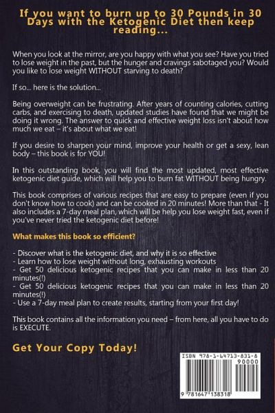 If you want to burn up to 30 Pounds in 30 Days with the Ketogenic Diet then keep reading... When you look at the mirror, are you happy with what you see? Have you tried to lose weight in the past, but the hunger and cravings sabotaged you? Would you like to lose weight WITHOUT starving to death?If so here is the solution... Being overweight can be frustrating. After years of counting calories, cutting carbs, and exercising to death, updated studies have found that we might be doing it wrong. The answer to quick and effective weight loss isn't about how much we eat - it's about what we eat! If you desire to sharpen your mind, improve your health or get a sexy, lean body - this book is for YOU! In this outstanding book, you will find the most updated, most effective ketogenic diet guide, which will help you to burn fat WITHOUT being hungry. This book comprises of various recipes that are easy to prepare (even if you don't know how to cook) and can be cooked in 20 minutes! More than that - It also includes a 7-day meal plan, which will be help you lose weight fast, even if you've never tried the ketogenic diet before! What makes this book so efficient? Discover what is the ketogenic diet, and why it is so effective 1. Learn how to lose weight without long, exhausting workouts Get 50 delicious ketogenic recipes that you can make in less than 20 minutes(!) Reveal the full list of benefits you can expect from the ketogenic diet Use a 7-day meal plan to create results, starting from your first day! This book contains all the information you need - from here, all you have to do is EXECUTE. Scroll up, click on "Buy Now", and Get Your Copy Now!