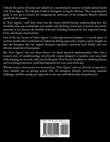 Unleash the power of ketosis and embark on a transformative journey towards optimal health with "Keto Queen: The Ultimate Guide to Ketogenic Living for Women." This comprehensive guide is your go-to resource for navigating the intricacies of the ketogenic lifestyle tailored specifically for women. In "Keto Queen," you'll delve deep into the science behind ketosis, understanding how this metabolic state can revolutionize your health and well-being. Learn how to unlock your body's potential as you discover the benefits of ketosis, including enhanced fat loss, improved energy levels, and sharper mental clarity. One of the key focuses of "Keto Queen" is achieving hormonal balance-a crucial aspect of women's health often overlooked in traditional dieting approaches. Explore expert insights on how the ketogenic diet can support hormone regulation, menstrual cycle health, and even alleviate symptoms of menopause. But "Keto Queen" isn't just about theory-it's about practical implementation. Dive into a treasure trove of mouthwatering, keto-friendly recipes designed to tantalize your taste buds while keeping you on track with your health goals. From hearty breakfasts to satisfying dinners and everything in between, you'll find inspiration for every meal of the day. Whether you're a keto novice or a seasoned pro, "Keto Queen" caters to all levels of experience. Gain valuable tips on getting started with the ketogenic lifestyle, overcoming common challenges, and fine-tuning your approach to suit your individual needs and preferences.