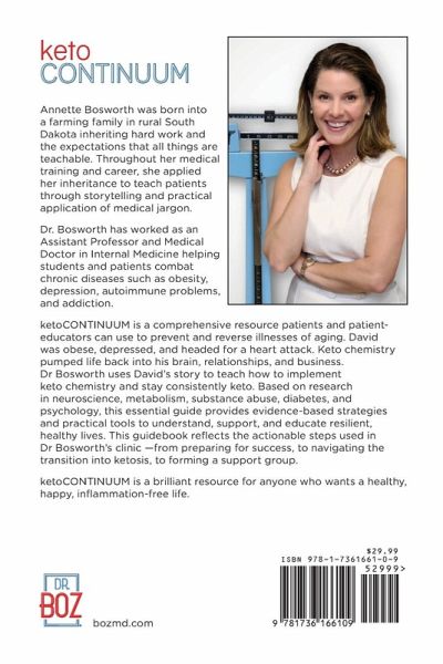 Annette Bosworth was born into a farming family in rural South Dakota inheriting hard work and the expectations that all things are teachable. Throughout her medical training and career, she applied her inheritance to teach patients through storytelling and practical application of medical jargon. Dr. Bosworth has worked as an Assistant Professor and Medical Doctor in Internal Medicine helping students and patients combat chronic diseases such as obesity, depression, autoimmune problems, and addiction. ketoCONTINUUM is a comprehensive resource patients and patient-educators can use to prevent and reverse illnesses of aging. David was obese, depressed, and headed for a heart attack. Keto chemistry pumped life back into his brain, relationships, and business. Dr Bosworth uses David's story to teach how to implement keto chemistry and stay consistently keto. Based on research in neuroscience, metabolism, substance abuse, diabetes, and psychology, this essential guide provides evidence-based strategies and practical tools to understand, support, and educate resilient, healthy lives. This guidebook reflects the actionable steps used in Dr Bosworth's clinic -from preparing for success, to navigating the transition into ketosis, to forming a support group. ketoCONTINUUM is a brilliant resource for anyone who wants healthy, happy, and inflammation-free lives.