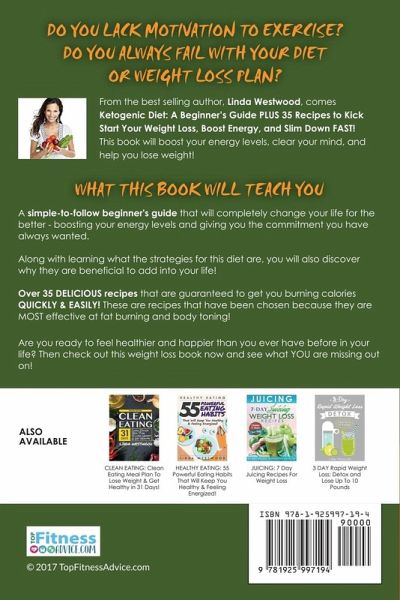 Do you lack motivation to exercise? Do you ALWAYS fail with your diet or weight loss plan? Then you NEED to read this book! From the best selling author, Linda Westwood, comes Ketogenic Diet: A Beginner's Guide PLUS 35 Recipes to Kick Start Your Weight Loss, Boost Energy, and Slim Down FAST! This book will boost your energy levels, clear your mind, and help you lose weight! What This Weight Loss Book Will Teach You This book provides you with a simple-to-follow beginner's guide that will completely change your life for the better - boosting your energy levels and giving you the commitment you have always wanted. Along with learning what the strategies for this diet are, you will also discover why they are beneficial to add into your life! ALSO, you will get over 35 DELICIOUS recipes that are guaranteed to get you burning calories QUICKLY & EASILY! These are recipes that have been chosen because they are MOST effective at fat burning and body toning! Are you ready to feel healthier and happier than you ever have before in your life? Then check out this weight loss book now and see what YOU are missing out on! If you successfully implement this guide, you will… • Feel happier than you ever have - because you will slim down FAST • Live a longer and healthier life • Say goodbye to low energy levels and depressing moods • Learn how you can live a healthier lifestyle without trying • BURN MORE fat than ever before! • NEVER feel tired or exhausted in your day - EVER AGAIN!