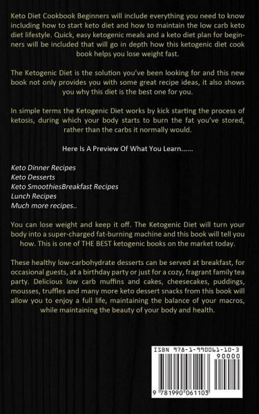 Keto Diet Cookbook Beginners will include everything you need to know including how to start keto diet and how to maintain the low carb keto diet lifestyle. Quick, easy ketogenic meals and a keto diet plan for beginners will be included that will go in depth how this ketogenic diet cook book helps you lose weight fast. The Ketogenic Diet is the solution you've been looking for and this new book not only provides you with some great recipe ideas, it also shows you why this diet is the best one for you. In simple terms the Ketogenic Diet works by kick starting the process of ketosis, during which your body starts to burn the fat you've stored, rather than the carbs it normally would. Here Is A Preview Of What You Learn...... Keto Dinner Recipes Keto Desserts Keto SmoothiesBreakfast Recipes Lunch Recipes Much more recipes.. You can lose weight and keep it off. The Ketogenic Diet will turn your body into a super-charged fat-burning machine and this book will tell you how. This is one of THE BEST ketogenic books on the market today. These healthy low-carbohydrate desserts can be served at breakfast, for occasional guests, at a birthday party or just for a cozy, fragrant family tea party. Delicious low carb muffins and cakes, cheesecakes, puddings, mousses, truffles and many more keto dessert snacks from this book will allow you to enjoy a full life, maintaining the balance of your macros, while maintaining the beauty of your body and health.
