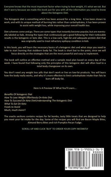 Everyone knows that the most important factor when trying to lose weight, it's what we eat. But don't worry because we made this book just for you with all the information you need to know about the Ketogenic Diet. The Ketogenic diet is something which has been around for a long time. It has been shown to work, and with its unique method of burning fats rather than carbohydrates, it has been proven to assist with weight loss, while improving your overall health too. Diet schemes come and go. There are some types that instantly become popular, but are eventually labeled as fads. Among the types that continuously get a good following for their noticeable results is the ketogenic or keto diet. This is a low-carb, high-fat and adequate-protein diet that was originally used to treat refractory epilepsy condition in kids In this book, you will learn the necessary basics of a ketogenic diet and what steps you need to take to start burning that stubborn body fat. The book is short but to the point, since we will focus directly on the strategies that are the most powerful and easy to implement. The book will outline an effective method and a sample meal plan based on every day of the week. I have found that following only the principles of this ketogenic diet will often lead to a total body changeover on its own. You don't need any weight loss pills that don't work or live on low-fat products. You will learn how the body really works, and why it's more effective to limit carbohydrate intake than fats to burn off body fat. Here Is A Preview Of What You'll Learn... Benefits Of Ketogenic Diet How To Lose Weight Effortlessly On Keto Diet How To Succeed On Keto DietUnderstanding The Ketogenic Diet What To Eat On Keto Foods to Avoid Much, much more!! The snacks sections contains recipes for fat bombs, tasty little treats that are designed to help you meet your fat intake for the day. Some of the recipes you will find are Bacon Maple Bites, Almond Berry Bites and rich Pumpkin Pecan Fudge. SCROLL UP AND CLICK 'BUY' TO ORDER YOUR COPY INSTANTLY
