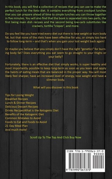 In this book, you will find a collection of recipes that you can use to make the perfect lunch for the Keto diet. It contains everything from crockpot lunches that you can prepare ahead of time to simple lunches you can throw together in five minutes. You will also find that the book is separated into two parts, the first being main dish recipes and the second being low-carb substitutes like crackers, tortilla "crepes", and more. Do you feel like you have tried every diet out there to lose weight or burn body fat, but that none of the diets have been effective for you, or simply too hard to follow long-term - and that's when you gain your lost weight back again! Or maybe you believe that you simply don't have the right "genetics" for burning body fat? Does everything you eat seem to go straight to your thighs or your belly? Fortunately, there is an effective diet that simply works, is super healthy and most importantly possible to keep long-term as soon as you learn and apply the habits of eating meals that are balanced in the proper way. You will most likely feel sharper, have an increased level of energy, lose weight and have a slimmer body. What will you discover in this book: Tips for Losing Weight Breakfast Recipes Lunch & Dinner Recipes Delicious Dessert Recipes Drinks RecipesWhat is the Ketogenic Diet Benefits of the Ketogenic Diet Common Mistakes to Avoid Foods to Eat and Foods to Avoid 21 Day Meal Plan And much more! To look great, feel great, and become your leanest, healthiest self, scroll up to the top and click BUY NOW!