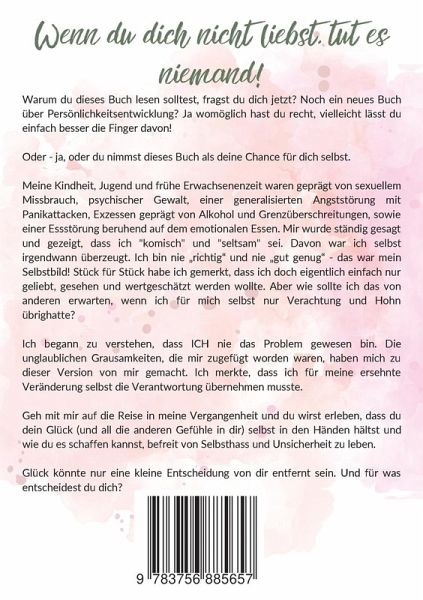Warum du dieses Buch lesen solltest, fragst du dich jetzt? Noch ein neues Buch über Persönlichkeitsentwicklung? Ja womöglich hast du recht, vielleicht lässt du einfach besser die Finger davon!Oder - ja, oder du nimmst dieses Buch als deine Chance für dich selbst.Meine Kindheit, Jugend und frühe Erwachsenenzeit waren geprägt von sexuellem Missbrauch, psychischer Gewalt, einer generalisierten Angststörung mit Panikattacken, Exzessen geprägt von Alkohol und Grenzüberschreitungen, sowie einer Essstörung beruhend auf dem emotionalen Essen. Mir wurde ständig gesagt und gezeigt, dass ich komisch und seltsam sei. Davon war ich selbst irgendwann überzeugt. Ich bin nie richtig und nie gut genug - das war mein Selbstbild! Stück für Stück habe ich gemerkt, dass ich doch eigentlich einfach nur geliebt, gesehen und wertgeschätzt werden wollte. Aber wie sollte ich das von anderen erwarten, wenn ich für mich selbst nur Verachtung und Hohn übrighatte?Ich begann zu verstehen, dass ICH nie das Problem gewesen bin. Die unglaublichen Grausamkeiten, die mir zugefügt worden waren, haben mich zu dieser Version von mir gemacht. Ich merkte, dass ich für meine ersehnte Veränderung selbst die Verantwortung übernehmen musste.Geh mit mir auf die Reise in meine Vergangenheit und du wirst erleben, dass du dein Glück (und all die anderen Gefühle in dir) selbst in den Händen hältst und wie du es schaffen kannst, befreit von Selbsthass und Unsicherheit zu leben.Glück könnte nur eine kleine Entscheidung von dir entfernt sein. Und für was entscheidest du dich?