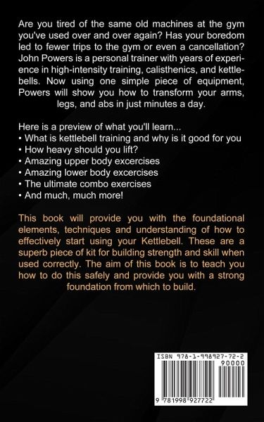 Are you tired of the same old machines at the gym you've used over and over again? Has your boredom led to fewer trips to the gym or even a cancellation? John Powers is a personal trainer with years of experience in high-intensity training, calisthenics, and kettlebells. Now using one simple piece of equipment, Powers will show you how to transform your arms, legs, and abs in just minutes a day. Here is a preview of what you'll learn...What is kettlebell training and why is it good for you How heavy should you lift? Amazing upper body excercises Amazing lower body excercises The ultimate combo exercises And much, much more! This book will provide you with the foundational elements, techniques and understanding of how to effectively start using your Kettlebell. These are a superb piece of kit for building strength and skill when used correctly. The aim of this book is to teach you how to do this safely and provide you with a strong foundation from which to build.