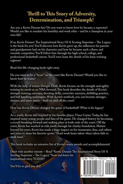 Thrill to This Story of Adversity, Determination, and Triumph! Are you a Kevin Durant fan? Do you want to know how he became a superstar? Would you like to emulate his humility and work ethic – and be a champion in your own life? If so, Kevin Durant: The Inspirational Story Of A Scoring Superstar – Kevin Durant – The Legacy is the book for you! You’ll discover how Kevin grew up, the influences his parents and grandparents had on his character, and how he became such a fierce and versatile competitor. You’ll follow him through his high school, college, and professional basketball careers. You’ll even learn the details of his basic training regimen! Read this life-changing book right away – Order Now! Do you want to be a "beast" on the court like Kevin Durant? Would you like to know how he trains? With the help of trainer Dwight Daub, Kevin focuses on the strength and agility training he needs as an NBA forward. This book describes the details of Kevin’s strength training exercises, shooting drills, corrective exercises, dribbling practice, and ball handling techniques. With Kevin’s methods, you can become stronger, sharper, and more aware – both on and off the court! How has Kevin Durant changed the game of basketball? What is his legacy? As a youth, Kevin was inspired by his favorite player, Vince Carter. Today, he has inspired many young people and fans of the game. He changed history by becoming a record-breaking forward and making plays at both ends of the court. Off the court, Kevin has reached at-risk youth through his charity foundation. Mature beyond his years, Kevin has made a huge impact on his teammates, fans, and others and loves to share his favorite quote: "Hard work beats talent when talent fails to work hard." This book includes an extensive list of Kevin’s many awards and accomplishments! Don’t wait another minute – Get a copy of Kevin Durant: The Inspirational Story Of A Scoring Superstar – Kevin Durant – The Legacy Now and learn his inspirational story TODAY! You’ll be so glad you did!