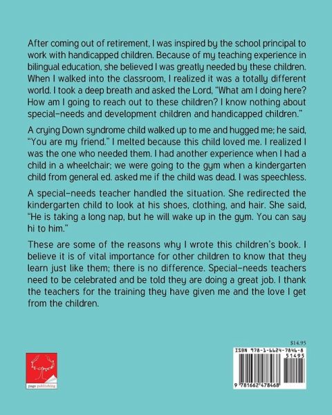 After coming out of retirement, I was inspired by the school principal to work with handicapped children. Because of my teaching experience in bilingual education, she believed I was greatly needed by these children. When I walked into the classroom, I realized it was a totally different world. I took a deep breath and asked the Lord, "What am I doing here? How am I going to reach out to these children? I know nothing about special-needs and development children and handicapped children." A crying Down syndrome child walked up to me and hugged me; he said, "You are my friend." I melted because this child loved me. I realized I was the one who needed them. I had another experience when I had a child in a wheelchair; we were going to the gym when a kindergarten child from general ed. asked me if the child was dead. I was speechless. A special-needs teacher handled the situation. She redirected the kindergarten child to look at his shoes, clothing, and hair. She said, "He is taking a long nap, but he will wake up in the gym. You can say hi to him." These are some of the reasons why I wrote this children's book. I believe it is of vital importance for other children to know that they learn just like them; there is no difference. Special-needs teachers need to be celebrated and be told they are doing a great job. I thank the teachers for the training they have given me and the love I get from the children.