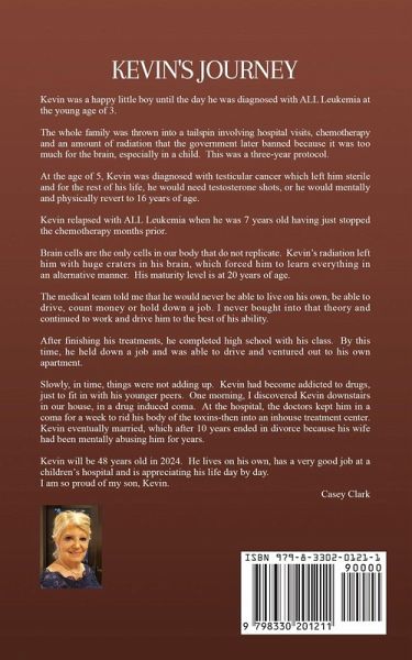 Kevin was a happy little boy until the day he was diagnosed with ALL Leukemia at the young age of 3. The whole family was thrown into a tailspin involving hospital visits, chemotherapy and an amount of radiation that the government later banned because it was too much for the brain, especially in a child. This was a three-year protocol. At the age of 5, Kevin was diagnosed with testicular cancer which left him sterile and for the rest of his life, he would need testosterone shots, or he would mentally and physically revert to 16 years of age. Kevin relapsed with ALL Leukemia when he was 7 years old having just stopped the chemotherapy months prior. Brain cells are the only cells in our body that do not replicate. Kevin's radiation left him with huge craters in his brain, which forced him to learn everything in an alternative manner. His maturity level is at 20 years of age. The medical team told me that he would never be able to live on his own, be able to drive, count money or hold down a job. I never bought into that theory and continued to work and drive him to the best of his ability. After finishing his treatments, he completed high school with his class. By this time, he held down a job and was able to drive and ventured out to his own apartment. Slowly, in time, things were not adding up. Kevin had become addicted to drugs, just to fit in with his younger peers. One morning, I discovered Kevin downstairs in our house, in a drug induced coma. At the hospital, the doctors kept him in a coma for a week to rid his body of the toxins-then into an inhouse treatment center. Kevin eventually married, which after 10 years ended in divorce because his wife had been mentally abusing him for years. Kevin will be 48 years old in 2024. He lives on his own, has a very good job at a children's hospital and is appreciating his life day by day. I am so proud of my son, Kevin. -Casey Clark