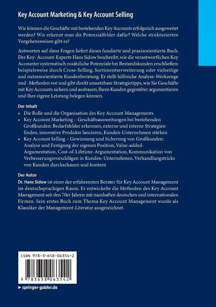 Antworten dazu liefert dieses fundierte und praxisorientierte Buch. Der Key-Account-Experte Hans Sidow beschreibt, wie die verantwortlichen Key Accounter systematisch zusätzliche Potenziale bei Bestandskunden erschließen: beispielsweise durch Cross-Selling, Sortimentserweiterung oder vielseitige und nutzenorientierte Kundenberatung. Er stellt hilfreiche Analyse-Werkzeuge und -Methoden vor und gibt direkt umsetzbare Strategietipps, wie Sie Geschäfte mit Key Accounts sichern und ausbauen und wie Sie den Kunden gegenüber argumentieren und Ihre eigene Leistung belegen können.