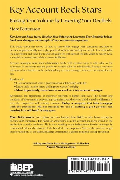 Key Account Rock Stars: Raising Your Volume by Lowering Your Decibels brings fresh new thoughts to the topic of Key Account Management. This book reveals the secrets of how to successfully engage with customers and how to become organizationally savvy, plus practical tools for succeeding on the job. It is written for the practitioner and takes readers through the soft sides of the job, which is exactly what is needed to succeed and achieve career fulfillment. Account managers must keep the relationship fresh, with creative ways to add value to the customers so customers remain genuinely satisfied with the relationship. Losing a customer will always be a burden on the individual Key Account Manager, whatever the reason for the loss. Readers willGain awareness of what a good customer relationship looks like, Learn tools to solve issues and improve ways of working, And most importantly, learn how to succeed as a Key Account Manager Remember, the importance of customer centricity is higher than ever. The decade long transition of the economy away from production towards services and the need to differentiate from the competition will certainly continue. A company today that fails to engage with the customers will not succeed; the era of making a good product and trusting it to sell itself is long gone.