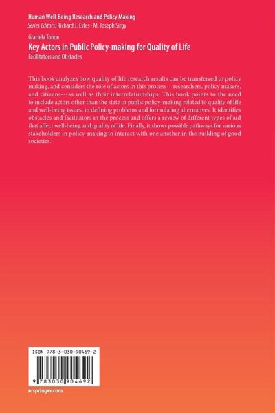 This book analyzes how quality of life research results can be transferred to policy making, and considers the role of actors in this process---researchers, policy makers, and citizens---as well as their interrelationships. This book points to the need to include actors other than the state in public policy-making related to quality of life and well-being issues, in defining problems and formulating alternatives. It identifies obstacles and facilitators in the process and offers a review of different types of aid that affect well-being and quality of life. Finally, it shows possible pathways for various stakeholders in policy-making to interact with one another in the building of good societies.