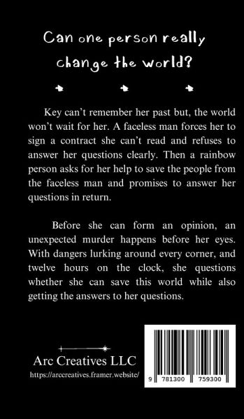 Waking up in a foreign world, Key is put between following an unclear man with no face or a rainbow person with a promise to answer her questions. After an unexpected murder, Key learns this world might be worse than she thought. With twelve hours on the clock, can she save the world and get the answers to her questions?