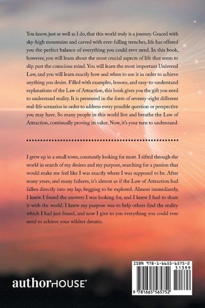 You know, just as well as I do, that this world truly is a journey. Graced with sky-high mountains and carved with ever-falling trenches, life has offered you the perfect balance of everything you could ever need. In this book, however, you will learn about the most crucial aspects of life that seem to slip past the conscious mind. You will learn the most important Universal Law, and you will learn exactly how and when to use it in order to achieve anything you desire. Filled with examples, lessons, and easy-to-understand explanations of the Law of Attraction, this book gives you the gift you need to understand reality. It is presented in the form of seventy-eight different real-life scenarios in order to address every possible question or perspective you may have. So many people in this world live and breathe the Law of Attraction, continually proving its value. Now, it's your turn to understand.