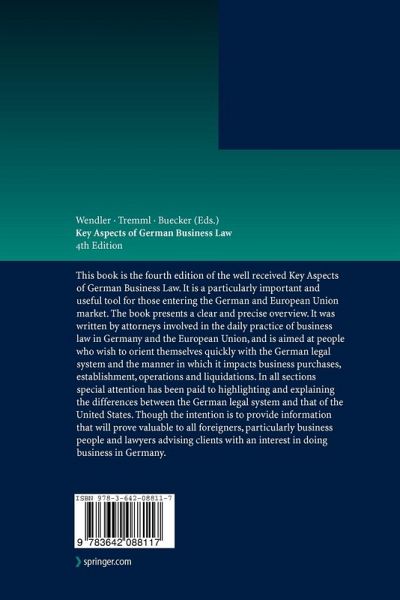 This book presents a clear and precise overview of the key aspects of German business law. It was written by attorneys involved in the daily practice of bu- ness law in Germany and is aimed at people who wish to orient themselves quickly with the German legal system and the manner in which it impacts bu- ness purchases, establishment, operations and liquidations. The first section of the book is devoted to an explanation of the major issues to be considered in acquiring or establishing a business in Germany. The second section focuses on areas of commercial law that are important for an operating business. In comparison to the last edition four new areas (transportation law, customs regulations, insurance law and state liability law) are treated. The f- lowing sections deal with labor law as an independent part of German business law and with computer law. Furthermore, procedural law and European law are addressed. Finally, the last two sections of the book are devoted to an overview over the German tax law, which has an enormous impact on business decisions, and IP law. In all sections special attention has been paid to highlighting and explaining the differences between the German legal system and that of the United States. Nevertheless, the intention is to provide information that will prove valuable to all foreigners, particularly business men and women and lawyers advising clients with an interest in doing business in Germany.