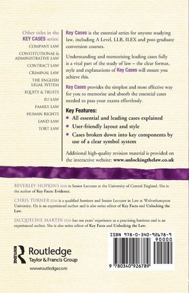 Author: Beverley Hopkins is Senior Lecturer at University of Central England. She is the author of Key Facts: Evidence. Series Editors: Chris Turner LLM is a qualified barrister and a Senior Lecturer in Law at Wolverhampton University. He is an experienced author and is also series editor for Key Facts and Unlocking the Law. Jacqueline Martin LLM has ten years' experience as a practising barrister and is an experienced author. She is also series editor for Key Facts and Unlocking the Law.