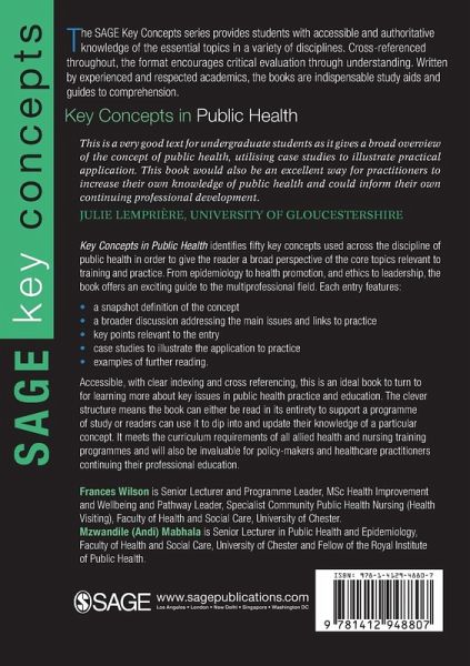 Key Concepts in Public Health identifies fifty key concepts used across the discipline of public health in order to give the reader a broad perspective of the core topics relevant to training and practice. From epidemiology to health promotion, and ethics to leadership, the book offers an exciting guide to the multiprofessional field.