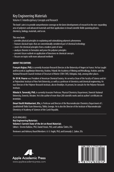 François Kajzar, PhD, is currently Associate Research Director at the University of Angers in France. He has taught and lectured at Jagellonian University, Kraków, Poland, the Academy of Mining and Metallurgy, Kraków; and National Research Council - Institute of Structure of Matter ( ISM-CNR), Bolognia, Italy, among other places. He was the Research Director and Senior Scientist at the Atomic Energy and Alternative Energies Commission, France. He has won numerous awards for his work and has written over 450 papers, book and book chapters, and conference presentations. He is also the editor of several journals and is on the editorial review bards of several others. His specialization fields include nonlinear optics, materials research, biomaterials, and biophotonics. Dr. Eli M. Pearce was President of American Chemical Society. He served as Dean of the Faculty of Science and Art at Brooklyn Polytechnic University in New York, as well as a professor of chemistry and chemical engineering. He was Director of the Polymer Research Institute, also in Brooklyn. At present, he consults for the Polymer Research Institute. A prolific author and researcher, he edited the Journal of Polymer Science (Chemistry Edition) for 25 years and was an active member of many professional organizations. N. ¿. ¿urovskij, PhD, is currently Associate Professor, Physical Chemistry Department, Donetsk National University, Donetsk, Ukraine. He is the author of more than 200 scientific works and six author's certificates on invention. He is a supervisor of four candidate's theses, head of two scientific projects of the International Scientific Fund and two projects of the International Soros Science Education Program. Dr. ¿urovskij has worked in the L. M. Litvinenko Institute of Physical Organic and Coal Chemistry National Academy of Sciences of Ukraine in job titles of the junior research fellow and senior scientific employee. His research interests include kinetics, structural chemistry, and molecular modeling of the supramolecular reactions of organic peroxides. Omari Vasilii Mukbaniani, DSc, is Professor and Director of Macromolecular Chemistry Department of I. Javakhishvili Tbilisi State University, Tbilisi, Georgia. He is also the Director of the Institute of Macromolecular Chemistry of Academy of Sciences of the Czech Republic. For several years he was a member of advisory board of the Journal Proceedings of Iv. Javakhishvili Tbilisi State University (Chemical Series), contributing editor of the journal Polymer News and the Polymers Research Journal. His research interests include polymer chemistry, polymeric materials and chemistry of organosilicon compounds. He is an author more than 360 publication, 8 books, 3 monographs, and 10 inventions.