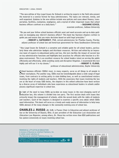 School business officials (SBOs) must, in many respects, serve as all things to all people in their workplaces. Put another way, SBOs must be knowledgeable about a wide range of legal issues ranging from contracts to setting policy to state biding laws let alone constitutional matters involving the rights of students and teachers. Aware of the fact that issues involving the law are at the heart of many of a SBO’s duties, the chapters in this edited book have been written by a diverse array of individuals with experience as educational leaders in schools and/ or who possess significant expertise in the school law. In light of the need to keep SBOs up-to-date on many issues in the ever changing world of Education Law, this volume is divided into two parts. The first section deals with issues that primarily impact on the management of schools while the second deals with the rights of students and teachers. More specifically, each of the chapters is designed to examine a specific area about which SBOs need information. While no single book can ever hope to cover all of the myriad of legal topics that SBOs and other educational leaders must master in their professional lives, this book will serve as an up-to-date and ready source of information to help keep them abreast of the many changes in the ever evolving area of school law.