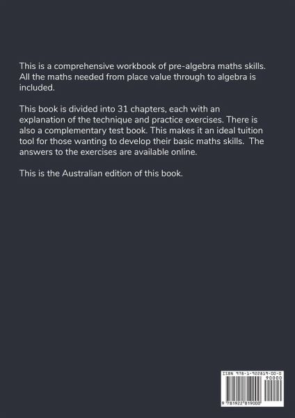 This is a comprehensive workbook of pre-algebra maths skills. All the maths needed from place value through to algebra is included. This book is divided into 31 chapters, each with an explanation of the technique and practice exercises. There is also a complementary test book. This makes it an ideal tuition tool for those wanting to develop their basic maths skills.The answers to the exercises are available online. This is the Australian edition of this book.