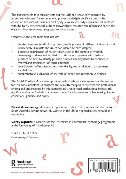 This indispensable book critically sets out the skills and knowledge required by a specialist educator for students who present with dyslexia. The British Dyslexia Association Professional Criteria (BDA, 2012) provides an anchor throughout for this book's content. Chapters are explicitly mapped to specific professional criteria, offering the reader confidence that guidance in Key Perspectives on Dyslexia is underpinned by this internationally recognised professional framework.¿¿ Key issues in the education and care of those affected by dyslexia are critically explained and explored in this publication, using both author's years of specialist experience in this field. As established scholars both authors also suggest how research can inform and enrich how an educator responds to these issues.¿¿ The content of this book includes: Detailed case studies disclosing how dyslexia presents in different individuals and which richly illuminate the issues considered by each chapter A concise examination of reading instruction in the context of typically-developing students and in relation to those who present with dyslexia: this incorporates an expert but accessible review of international policy and educational practice, including influential findings from research Detailed guidance on how to identify possible dyslexia and key issues to consider in referral and assessment of those affected, including associated models here such as Response to Intervention (RTI)¿ Consideration of intelligence and in how this figures in relation to assessment for dyslexia, including the possible role of intellectual disability (ID). Comprehensive evaluation of the role of behaviour in relation to dyslexia, with guidance on how this can be used to inform a programme of support for students with social, emotional or behavioural difficulties (EBD/SEBD). Consideration of how the professional role of a specialist educator might travel across the English speaking world and also beyond in China or India.¿¿ Key Perspectives on Dyslexia is an essential text for educators and will become a landmark guide for educational practice and policy.¿¿¿