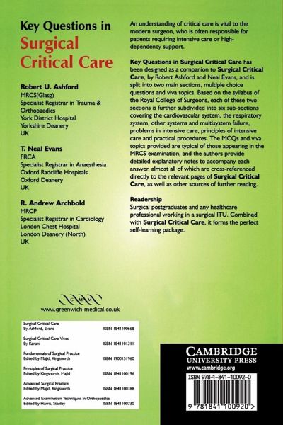 An understanding of critical care is vital to the modern surgeon, who is often responsible for patients requiring intensive care or high-dependency support. Key Questions in Surgical Critical Care has been designed as a companion to Surgical Critical Care, by Robert Ashford and Neal Evans, and is split into two main sections, multiple choice questions and viva topics. Based on the syllabus of the Royal College of Surgeons, each of these two sections is further subdivided into six sub-sections covering the cardiovascular system, the respiratory system, other systems and multisystem failure, problems in intensive care, principles of intensive care and practical procedures. The MCQs and viva topics provided are typical of those appearing in the MRCS examination, and the authors provide detailed explanatory notes to accompany each answer, almost all of which are cross-referenced directly to the relevant pages of Surgical Critical Care, as well as other sources of further reading.