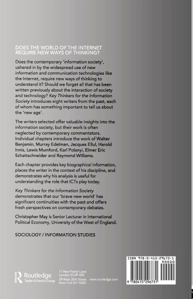 Key Thinkers for the Information Society provides an introduction to some important social theorists whose work has considerable relevance to today's 'brave new world' of information and communication technologies. With the aim of widening current perspectives on the information society, each contributor introduces a particular theorist and discusses the way in which their insights can be reintroduced into debates regarding the social, political and cultural impact of ICTs. Theorists presented in Volume 1 include some well-known and some less well-known figures: Walter Benjamin; Murray Edeleman; Jacques Ellul; Harold Innes; Lewis Mumford; Karl Polanyi; Eric Elmer Scattachneider and Raymond Williams. Each has something fresh and pertinent to say and taken as a whole this volume provides an exciting new resource for contemporary studies.