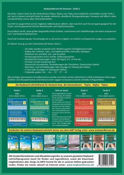 Die Stufe 2 dieser Serie für die Generationen 55plus, 65plus und 75plus baut didaktisch unmittelbar auf der Stufe 1 auf. Auch in diesem Lehrheft finden Sie wieder zahlreiche, detaillierte Übungsanleitungen, Hinweise und Hilfen in allen Lernabschnitten und zu allen Themenbereichen. Das Heft ist ausgerichtet auf ein mögliches Selbststudium daheim, aber natürlich auch hervorragend geeignet für den Einzel- und Gruppenunterricht an Musikschulen und Volkshochschulen. Eine größere Schrift, sowie größer dargestellte Detail-Grafiken, unterstützen auch Sehhilfenträger bei einem entspannten Lern- und Keyboardspielprozess. Durch die Erweiterung des Tonumfanges bis zu d3 wird es möglich, ein wirklich umfangreiches Liedgut zu erarbeiten. Ein kleiner Auszug aus dem Elementarstoff dieser Stufe 2: - 20 Lieder werden erarbeitet - Aufbau der Tonleiter - Ganz- und Halbtonschritte - Intervalle, Synkopen - Definition Dur und Moll - Leit- und Grundton - Versetzungszeichen Kreuz und Be - Auflösungszeichen - Musikalische Anweisungen: Coda, Dal Segno, D.C. al Fine etc. - Fermate und die Anweisung: 8va. - Dynamische Grundstufen - Veränderungen der Tonstärken - Dynamisches Spielen - Notenlese- und Schreibübungen (alle Lösungen im Anhang des Heftes) - 3 Tests (alle Lösungen im Anhang des Heftes) - 5 Akkorde spielen: Dm - Am - D7 - E7 - A7 Alle wichtigen elementaren Grundkenntnisse werden vermittelt und die zahlreichen im Heft enthaltenen Erklärungen, Grafiken und Übungshinweise unterstützen einen zügigen Lernprozess und ein schnelles Erfolgserlebnis. Weiterführende Informationen finden Sie unter: www.keyboardlernen.de