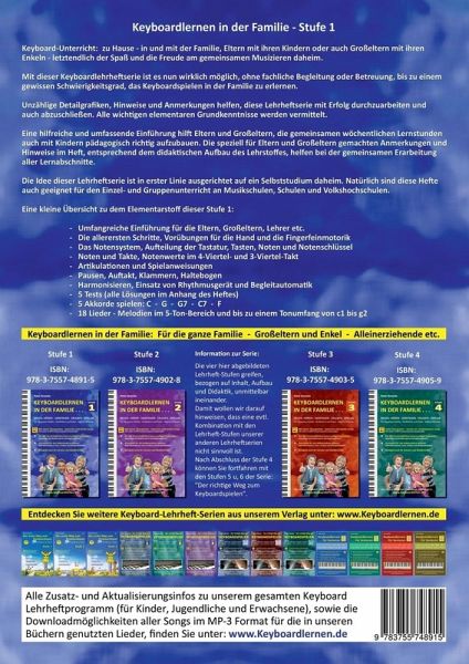 Keyboard-Unterricht - Keyboard lernen: zu Hause - in und mit der Familie, Eltern mit ihren Kindern oder auch Großeltern mit ihren Enkeln - letztendlich der Spaß und die Freude am gemeinsamen Musizieren daheim. Mit dieser Keyboardlehrheftserie ist es nun wirklich möglich, ohne fachliche Begleitung oder Betreuung, bis zu einemgewissen Schwierigkeitsgrad, das Keyboardspielen in der Familie zu erlernen. Unzählige Detailgrafiken, Hinweise und Anmerkungen helfen, diese Lehrheftserie mit Erfolg durchzuarbeiten und auch abzuschließen. Alle wichtigen elementaren Grundkenntnisse werden vermittelt. Eine hilfreiche und umfassende Einführung hilft Eltern und Großeltern, die gemeinsamen wöchentlichen Lernstunden auch mit Kindern pädagogisch richtig aufzubauen. Die speziell für Eltern und Großeltern gemachten Anmerkungen und Hinweise im Heft, entsprechend dem didaktischen Aufbau des Lehrstoffes, helfen bei der gemeinsamen Erarbeitung aller Lernabschnitte. Die Idee dieser Lehrheftserie ist in erster Linie ausgerichtet auf ein Selbststudium daheim. Natürlich sind diese Hefte auch geeignet für den Einzel- und Gruppenunterricht an Musikschulen und Volkshochschulen.Eine kleine Übersicht zu dem Elementarstoff dieser Stufe 1:- Umfangreiche Einführung für die Eltern, Großeltern, Lehrer etc. - Die allerersten Schritte - Vorübungen für die Hand und die Fingerfeinmotorik- Das Notensystem, Aufteilung der Tastatur - Tasten, Noten und Notenschlüssel - Noten und Takte - Notenwerte im 4-Viertel- und 3-Viertel-Takt - Artikulationen und Spielanweisungen - Pausen, Auftakt, Klammern, Haltebogen - Harmonisieren - Einsatz von Rhythmusgerät und Begleitautomatik - 5 Tests (alle Lösungen im Anhang des Heftes) - 5 Akkorde spielen: C - G - G7 - C7 - F - 18 Lieder - Melodien im 5-Ton-Bereich, Tonumfang von c1 bis g2Weitere Informationen zur Lehrheftserie erhalten Sie unter: www.Keyboardlernen.de