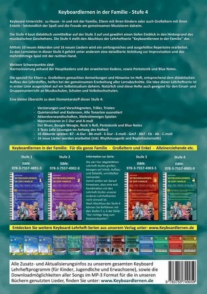 Keyboard-Unterricht - Keyboard lernen: zu Hause - in und mit der Familie, Eltern mit ihren Kindern oder auch Großeltern mit ihren Enkeln - letztendlich der Spaß und die Freude am gemeinsamen Musizieren daheim. Die Stufe 4 baut didaktisch unmittelbar auf der Stufe 3 auf und gewährt einen tiefen Einblick in den Hintergrund des musikalischen Geschehens. Die Stufe 4 stellt den Abschluss der Lehrheftserie "Keyboardlernen in der Familie" dar. Mittels 10 neuen Akkorden und 16 neuen Liedern wird ein umfangreiches und ausgefeiltes Repertoire erarbeitet. Zu den Lernzielen in dieser Stufe 4 gehört unter anderem eine detaillierte Anleitung zur Improvisation und das mehrstimmige Spiel mit der rechten Hand. Weitere Schwerpunkte sind: Harmonisierung anhand der Hauptkadenz und der erweiterten Kadenz, sowie Pentatonik und Blue Notes. Die speziell für Eltern u. Großeltern gemachten Anmerkungen und Hinweise im Heft, entsprechend dem didaktischen Aufbau des Lehrstoffes, helfen bei der gemeinsamen Erarbeitung aller Lernabschnitte. Die Idee dieser Lehrheftserie ist in erster Linie ausgerichtet auf ein Selbststudium daheim. Natürlich sind diese Hefte auch geeignet für den Einzel- und Gruppenunterricht an Musikschulen, Schulen und Volkshochschulen. Eine kleine Übersicht zu dem Elementarstoff dieser Stufe 4: - Verzierungen und Vorschlagnoten, Triller, Triolen - Quintenzirkel und Kadenzen, Alle Tonarten ausnotiert - Akkordverwandtschaften, Mehrstimmiges Spielen - Harmonisieren in C-Dur und A-moll - Der Blues, Boogie Woogie, Rock´n Roll, Pentatonik und Blue Notes - 3 Tests (alle Lösungen im Anhang des Heftes) - 10 Akkorde spielen: B7 - A-Dur - Bb-moll - E-Dur - E-moll - Gm7 - Bb7 - Eb - Ab - C-moll - 16 neue Lieder werden erarbeitet (inkl. Rhythmusgerät und Begleitautomatik)Weitere Informationen zur Lehrheftserie erhalten Sie unter: www.Keyboardlernen.de