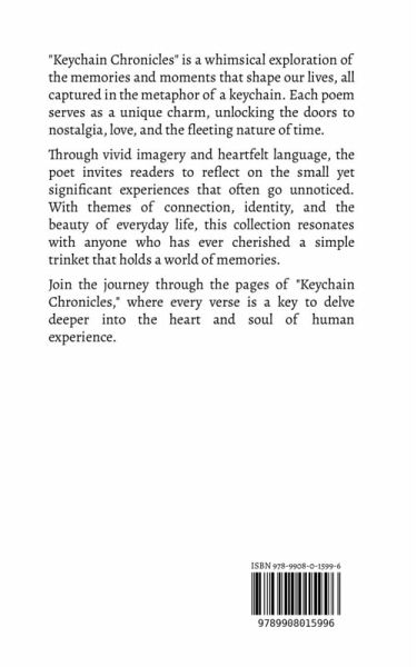 "Keychain Chronicles" is a whimsical exploration of the memories and moments that shape our lives, all captured in the metaphor of a keychain. Each poem serves as a unique charm, unlocking the doors to nostalgia, love, and the fleeting nature of time. Through vivid imagery and heartfelt language, the poet invites readers to reflect on the small yet significant experiences that often go unnoticed. With themes of connection, identity, and the beauty of everyday life, this collection resonates with anyone who has ever cherished a simple trinket that holds a world of memories. Join the journey through the pages of "Keychain Chronicles," where every verse is a key to delve deeper into the heart and soul of human experience.